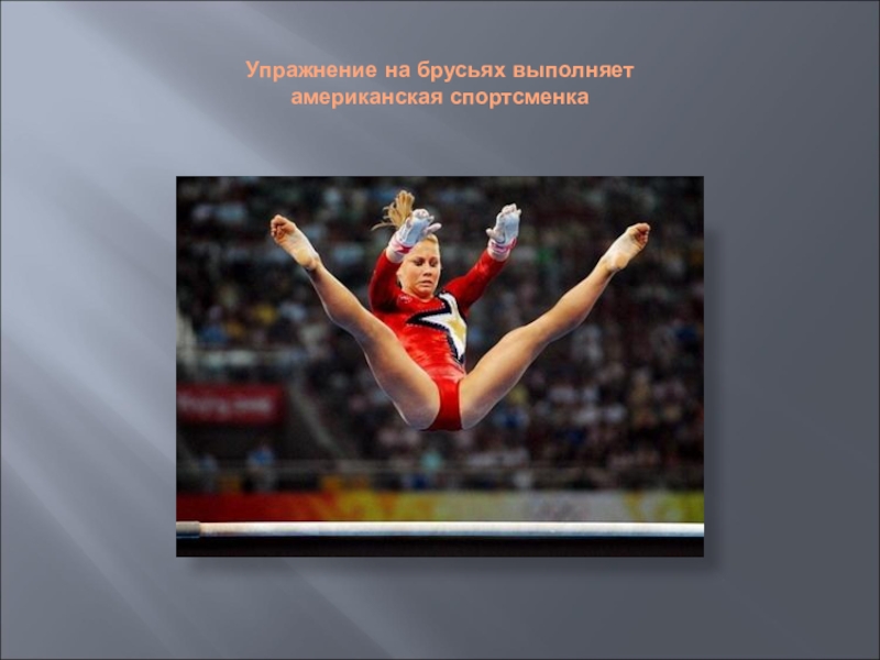 Слайд 12Упражнение на брусьях выполняет американская спортсменка