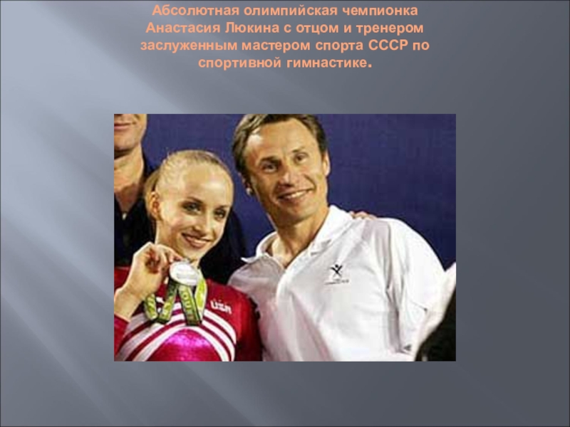 Слайд 28Абсолютная олимпийская чемпионка Анастасия Люкина с отцом и тренером заслуженным мастером