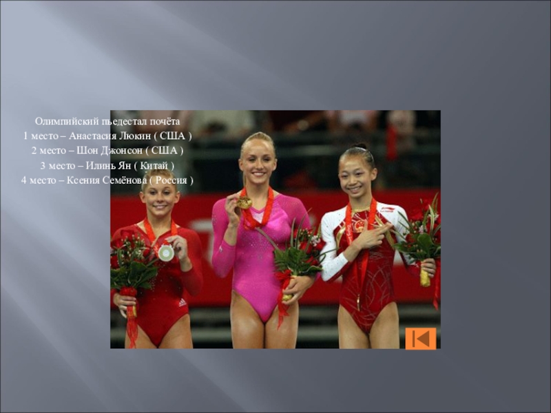 Олимпийский пьедестал почёта1 место – Анастасия Люкин ( США )2 место – Шон Джонсон ( США )3