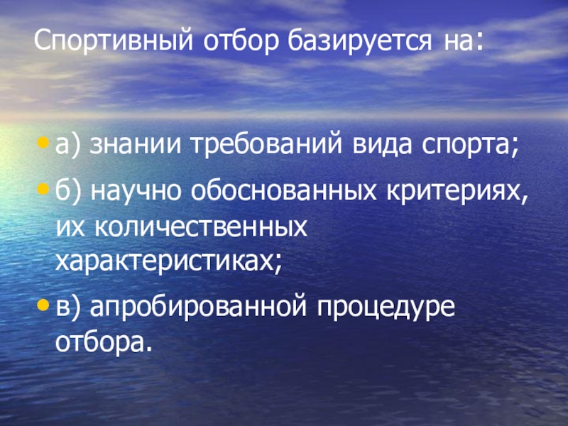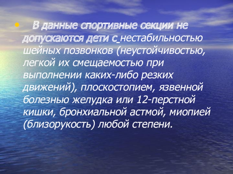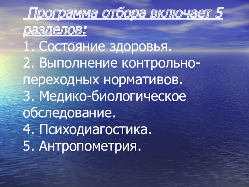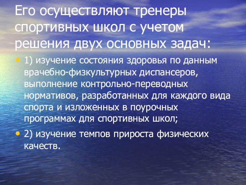 1) изучение состояния здоровья по данным врачебно-физкультурных диспансеров, выполнение контрольно-переводных нормативов, разработанных для каждого вида спорта и изложенных в поурочных программах для спортивных школ;