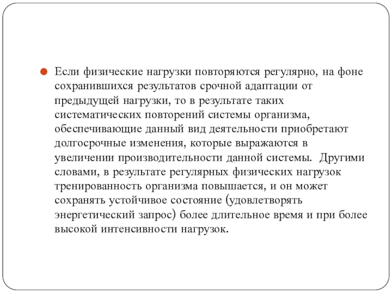 Слайд 4Если физические нагрузки повторяются регулярно, на фоне сохранившихся результатов срочной адаптации