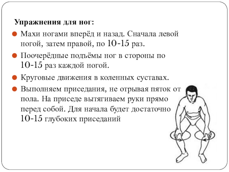 Выполняем приседания, не отрывая пяток от пола. На приседе вытягиваем руки прямо перед собой. Для начала будет достаточно 10-15 глубоких приседаний