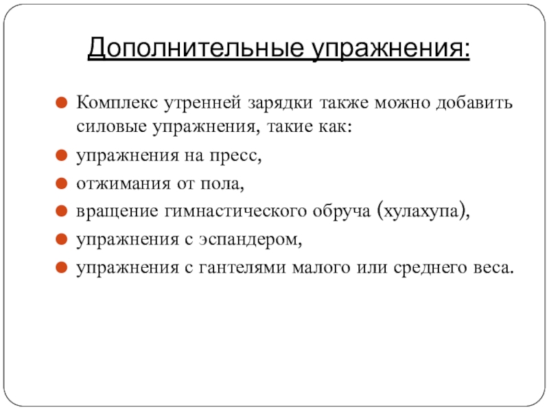 Комплекс утренней зарядки также можно добавить силовые упражнения, такие как: