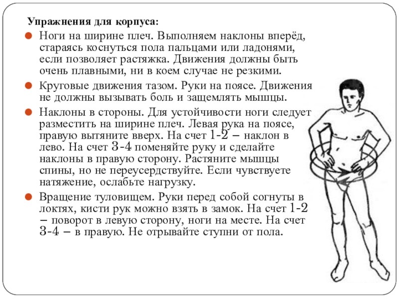 Круговые движения тазом. Руки на поясе. Движения не должны вызывать боль и защемлять мышцы.