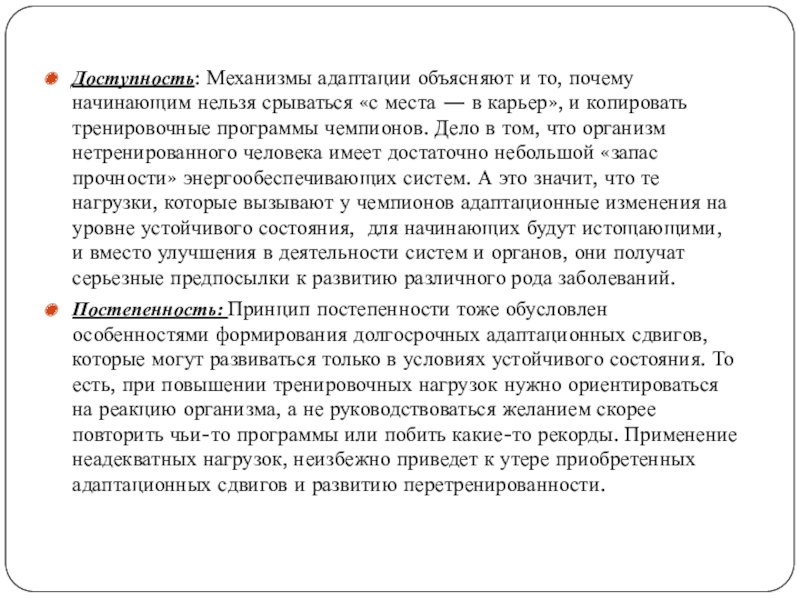 Слайд 6Доступность: Механизмы адаптации объясняют и то, почему начинающим нельзя срываться «с
