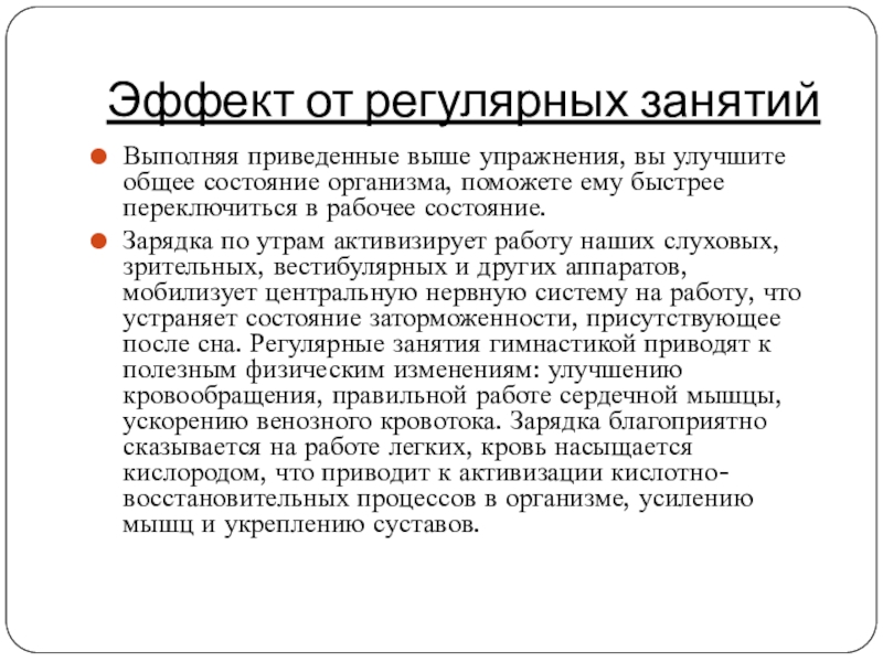 Зарядка по утрам активизирует работу наших слуховых, зрительных, вестибулярных и других аппаратов, мобилизует центральную нервную систему на работу, что устраняет состояние заторможенности, присутствующее после сна. Регулярные занятия гимнастикой приводят к полезным физическим изменениям: улучшению кровообращения, правильной работе сердечной мышцы, ускорению венозного кровотока. Зарядка благоприятно сказывается на работе легких, кровь насыщается кислородом, что приводит к активизации кислотно-восстановительных процессов в организме, усилению мышц и укреплению суставов.