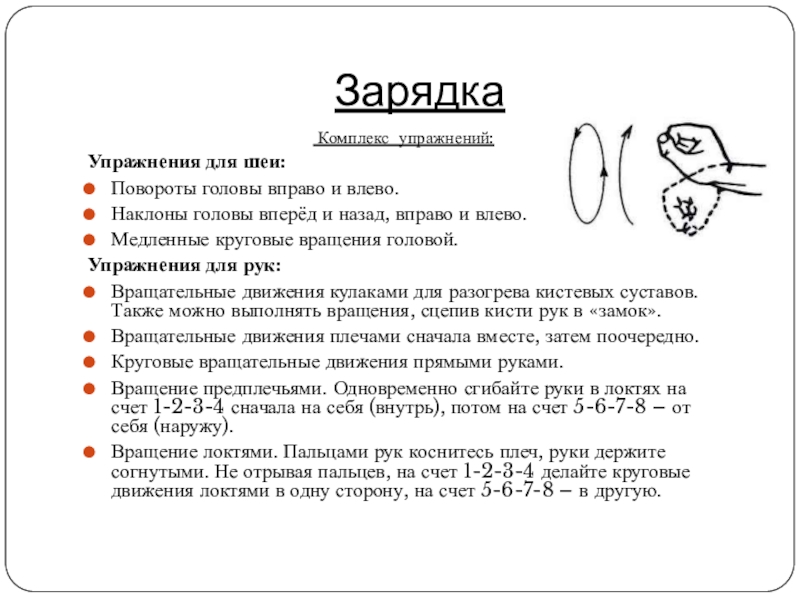 Вращение локтями. Пальцами рук коснитесь плеч, руки держите согнутыми. Не отрывая пальцев, на счет 1-2-3-4 делайте круговые движения локтями в одну сторону, на счет 5-6-7-8 – в другую.