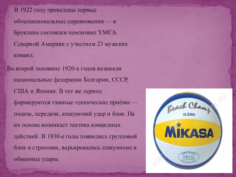 Во второй половине 1920-х годов возникли национальные федерации Болгарии, СССР, США и Японии. В тот же период формируются главные технические приёмы — подача, передачи, атакующий удар и блок. На их основе возникает тактика командных действий. В 1930-е годы появились групповой блок и страховка, варьировались атакующие и обманные удары.