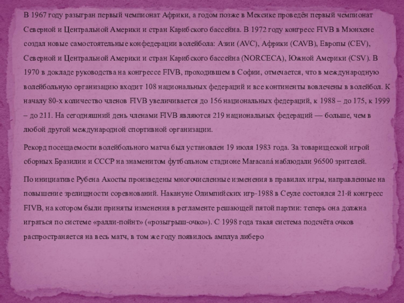 годом позже в Мексике проведён первый чемпионат Северной и Центральной Америки и стран Карибского бассейна. В 1972 году конгресс FIVB в Мюнхене создал новые самостоятельные конфедерации волейбола: Азии (AVC), Африки (CAVB), Европы (CEV), Северной и Центральной Америки и стран Карибского бассейна (NORCECA), Южной Америки (CSV). В 1970 в докладе руководства на конгрессе FIVB, проходившем в Софии, отмечается, что в международную волейбольную организацию входит 108 национальных федераций и все континенты вовлечены в волейбол. К началу 80-х количество членов FIVB увеличивается до 156 национальных федераций, к 1988 – до 175, к 1999 – до 211. На сегодняшний день членами FIVB являются 219 национальных федераций — больше, чем в любой другой международной спортивной организации.