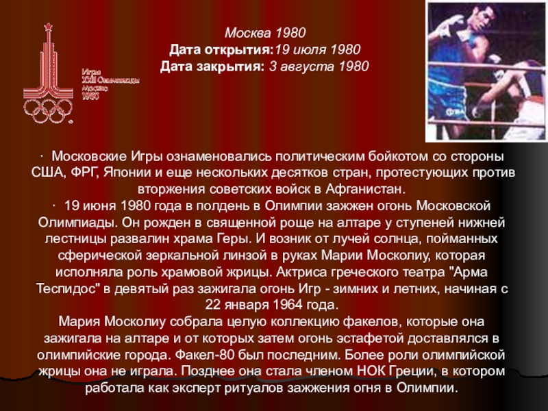 · 19 июня 1980 года в полдень в Олимпии зажжен огонь Московской Олимпиады. Он рожден в священной роще на алтаре у ступеней нижней лестницы развалин храма Геры. И возник от лучей солнца, пойманных сферической зеркальной линзой в руках Марии Москолиу, которая исполняла роль храмовой жрицы. Актриса греческого театра "Арма Теспидос" в девятый раз зажигала огонь Игр - зимних и летних, начиная с 22 января 1964 года.