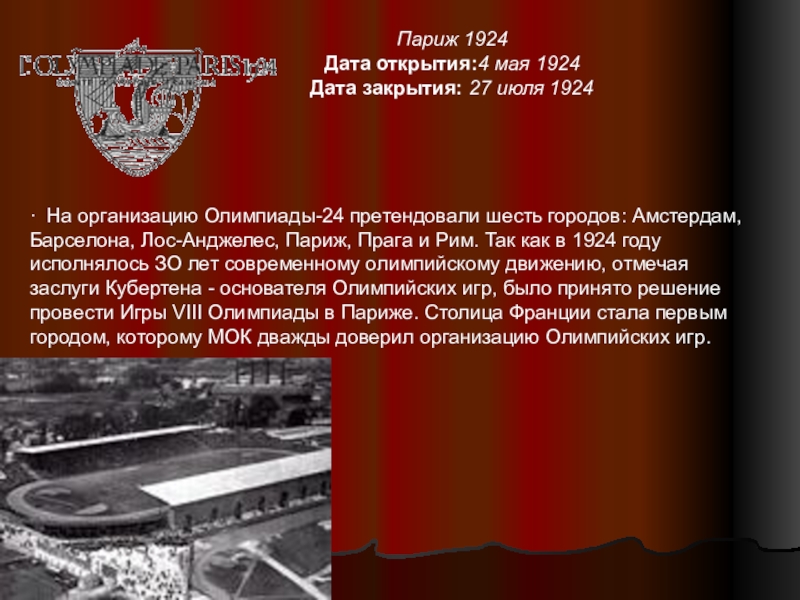 претендовали шесть городов: Амстердам, Барселона, Лос-Анджелес, Париж, Прага и Рим. Так как в 1924 году исполнялось ЗО лет современному олимпийскому движению, отмечая заслуги Кубертена - основателя Олимпийских игр, было принято решение провести Игры VIII Олимпиады в Париже. Столица Франции стала первым городом, которому МОК дважды доверил организацию Олимпийских игр.
