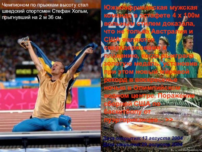 4 х 100м вольным стилем доказала, что не толька Австралия и США являются сверхдержавами в плаванию, когда выиграла золотую медаль, установив при этом новый мировой рекорд в воскресенье ночью в Олимпийском водном центре. Поражение сборной США по баскетболу от