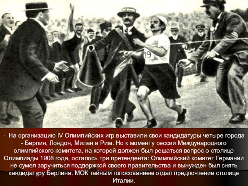 - Берлин, Лондон, Милан и Рим. Но к моменту сессии Международного олимпийского комитета, на которой должен был решаться вопрос о столице Олимпиады 1908 года, осталось три претендента: Олимпийский комитет Германии не сумел заручиться поддержкой своего правительства и вынужден был снять кандидатуру Берлина. МОК тайным голосованием отдал предпочтение столице Италии.