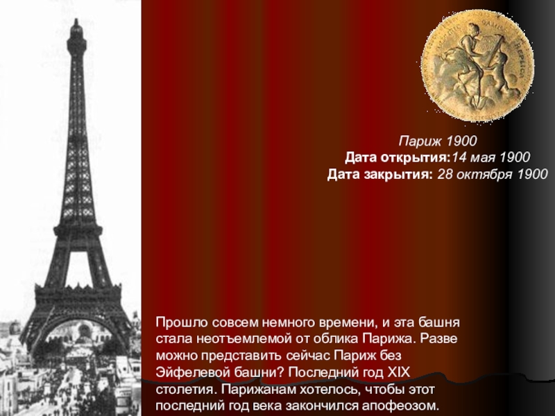 и эта башня стала неотъемлемой от облика Парижа. Разве можно представить сейчас Париж без Эйфелевой башни? Последний год XIX столетия. Парижанам хотелось, чтобы этот последний год века закончился апофеозом.