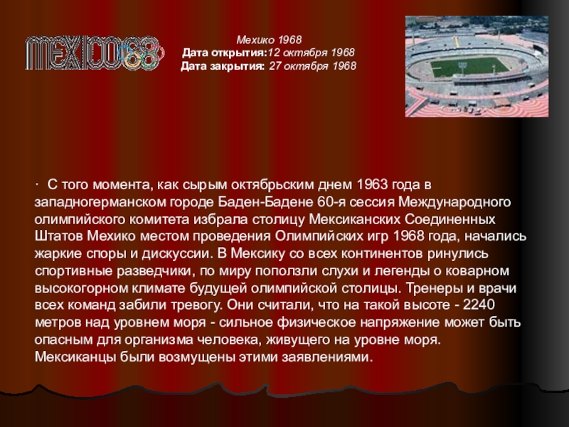 как сырым октябрьским днем 1963 года в западногерманском городе Баден-Бадене 60-я сессия Международного олимпийского комитета избрала столицу Мексиканских Соединенных Штатов Мехико местом проведения Олимпийских игр 1968 года, начались жаркие споры и дискуссии. В Мексику со всех континентов ринулись спортивные разведчики, по миру поползли слухи и легенды о коварном высокогорном климате будущей олимпийской столицы. Тренеры и врачи всех команд забили тревогу. Они считали, что на такой высоте - 2240 метров над уровнем моря - сильное физическое напряжение может быть опасным для организма человека, живущего на уровне моря.