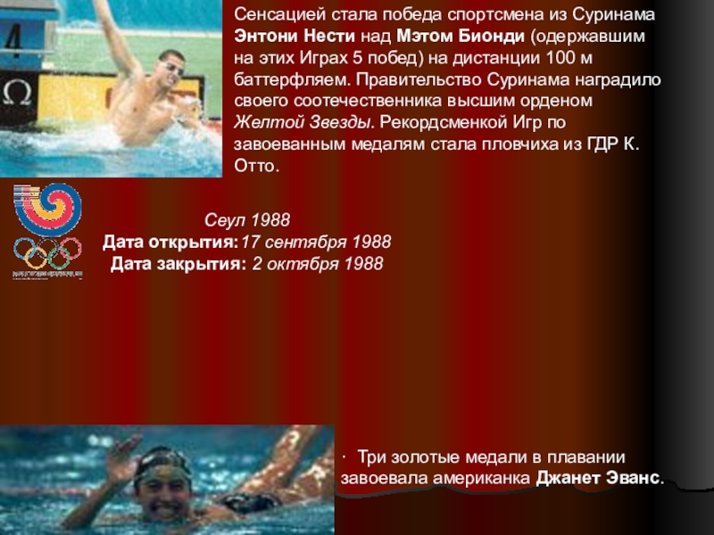· Три золотые медали в плавании завоевала американка Джанет Эванс.