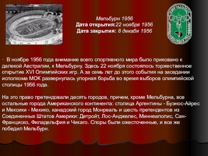 года внимание всего спортивного мира было приковано к далекой Австралии, к Мельбурну. Здесь 22 ноября состоялось торжественное открытие XVI Олимпийских игр. А за семь лет до этого события на заседании исполкома МОК развернулась упорная борьба во время выборов олимпийской столицы 1956 года.