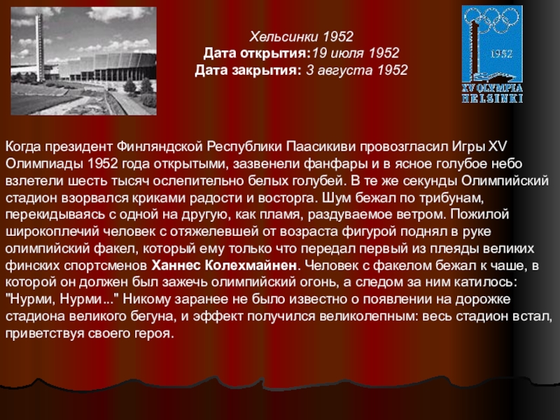 Паасикиви провозгласил Игры XV Олимпиады 1952 года открытыми, зазвенели фанфары и в ясное голубое небо взлетели шесть тысяч ослепительно белых голубей. В те же секунды Олимпийский стадион взорвался криками радости и восторга. Шум бежал по трибунам, перекидываясь с одной на другую, как пламя, раздуваемое ветром. Пожилой широкоплечий человек с отяжелевшей от возраста фигурой поднял в руке олимпийский факел, который ему только что передал первый из плеяды великих финских спортсменов Ханнес Колехмайнен. Человек с факелом бежал к чаше, в которой он должен был зажечь олимпийский огонь, а следом за ним катилось: "Нурми, Нурми..." Никому заранее не было известно о появлении на дорожке стадиона великого бегуна, и эффект получился великолепным: весь стадион встал, приветствуя своего героя.