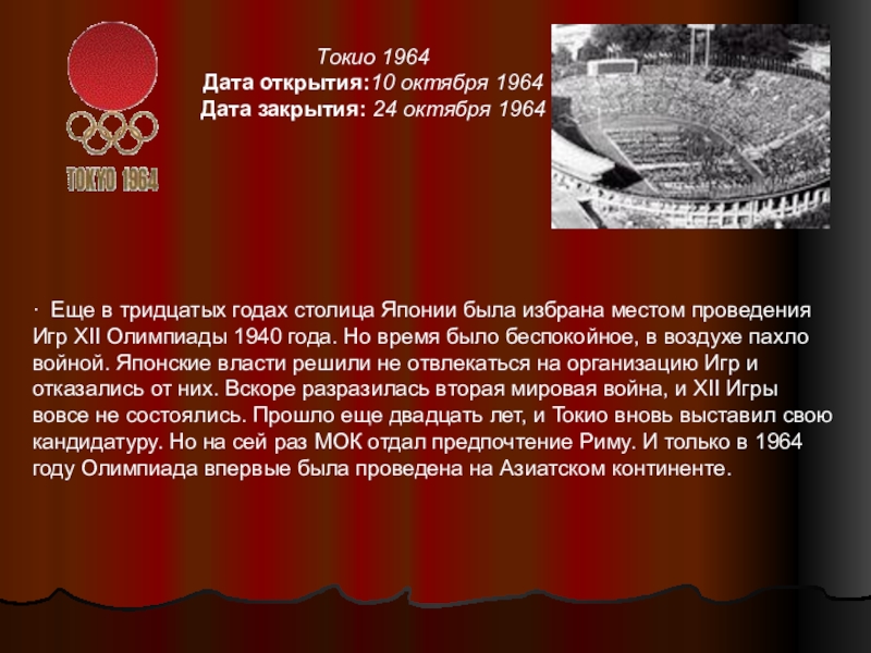 годах столица Японии была избрана местом проведения Игр XII Олимпиады 1940 года. Но время было беспокойное, в воздухе пахло войной. Японские власти решили не отвлекаться на организацию Игр и отказались от них. Вскоре разразилась вторая мировая война, и XII Игры вовсе не состоялись. Прошло еще двадцать лет, и Токио вновь выставил свою кандидатуру. Но на сей раз МОК отдал предпочтение Риму. И только в 1964 году Олимпиада впервые была проведена на Азиатском континенте.