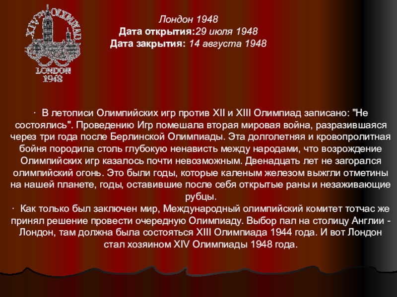 · Как только был заключен мир, Международный олимпийский комитет тотчас же принял решение провести очередную Олимпиаду. Выбор пал на столицу Англии - Лондон, там должна была состояться XIII Олимпиада 1944 года. И вот Лондон стал хозяином XIV Олимпиады 1948 года.