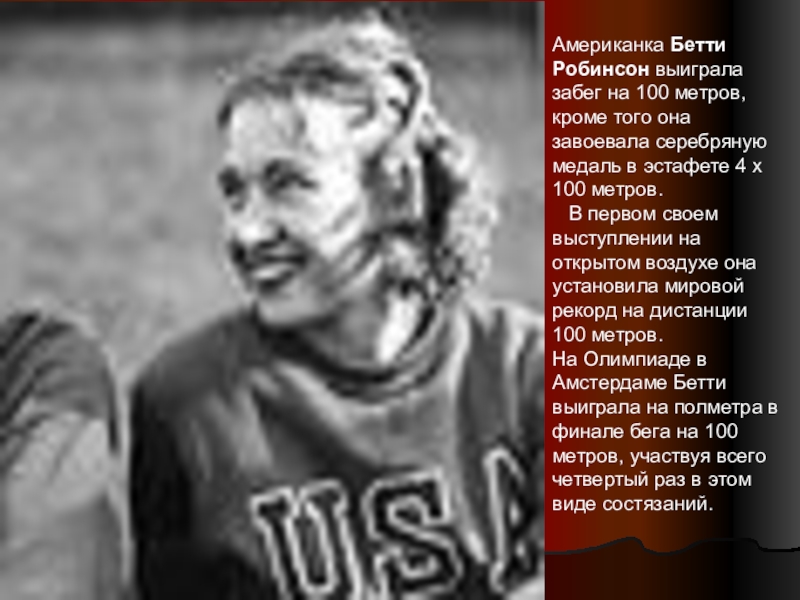Слайд 10Американка Бетти Робинсон выиграла забег на 100 метров, кроме того она