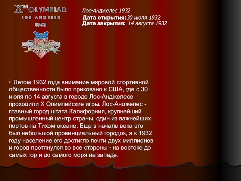 ∙ Летом 1932 года внимание мировой спортивной общественности было приковано к США, где с 30 июля по 14 августа в городе Лос-Анджелесе проходили X Олимпийские игры. Лос-Анджелес - главный город штата Калифорния, крупнейший промышленный центр страны, один из важнейших портов на Тихом океане. Еще в начале века это был небольшой провинциальный городок, а к 1932 году население его достигло почти двух миллионов и город протянулся во все стороны - на востоке до самых гор и до самого моря на западе.