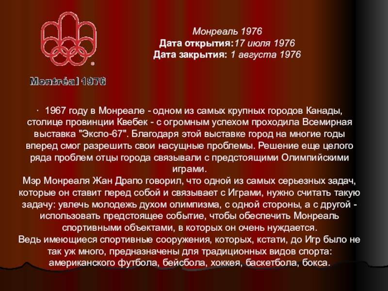 Мэр Монреаля Жан Драпо говорил, что одной из самых серьезных задач, которые он ставит перед собой и связывает с Играми, нужно считать такую задачу: увлечь молодежь духом олимпизма, с одной стороны, а с другой - использовать предстоящее событие, чтобы обеспечить Монреаль спортивными объектами, в которых он очень нуждается.