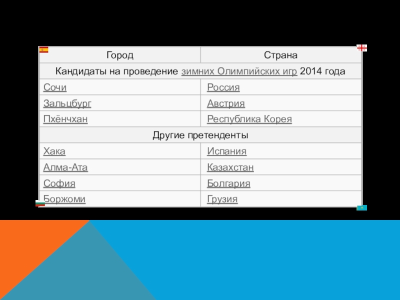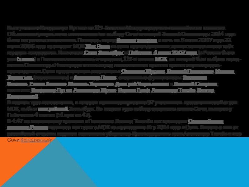 Выступление Владимира Путина на 119-й сессии Международного олимпийского комитета. Объявление результатов голосования по выбору Сочи столицей Зимней Олимпиады 2014 года было встречено ликованием. Площадь перед Зимним театром в ночь на 5 июля 2007 года.22 июня 2006 года президент МОК Жак Рогге из семи претендовавших заявок назвал имена трёх городов-кандидатов. Ими стали Сочи, Зальцбург и Пхёнчхан. 4 июля 2007 года (в России было уже 5 июля) в Гватемале состоялась очередная, 119-я сессия МОК, на которой был выбран город-хозяин Олимпиады.Непосредственно перед голосованием прошли презентации городов-претендентов. Сочи представляли спортсмены: Светлана Журова, Евгений Плющенко, Михаил Терентьев (паралимпиец) и Александр Попов; спортивные функционеры: Вячеслав Фетисов, Елена Аникина, Шамиль Тарпищев, Дмитрий Чернышенко и Виталий Смирнов; политики: Владимир Путин, Александр Жуков, Герман Греф, Александр Ткачёв, Виктор Колодяжный.