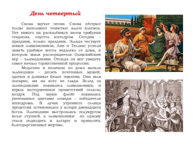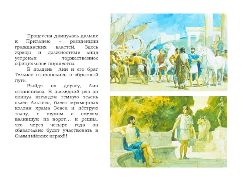 Нет никого на раскалённых зноем трибунах стадиона, опустел ипподром. Сегодня – праздник, только праздник. Эллада чествует новых олимпиоников. Лин и Теллиас успели занять удобные места недалеко от дома, в котором жили распорядители Олимпийских игр – элленодоники. Отсюда он мог увидеть самое начало торжественной процессии.
