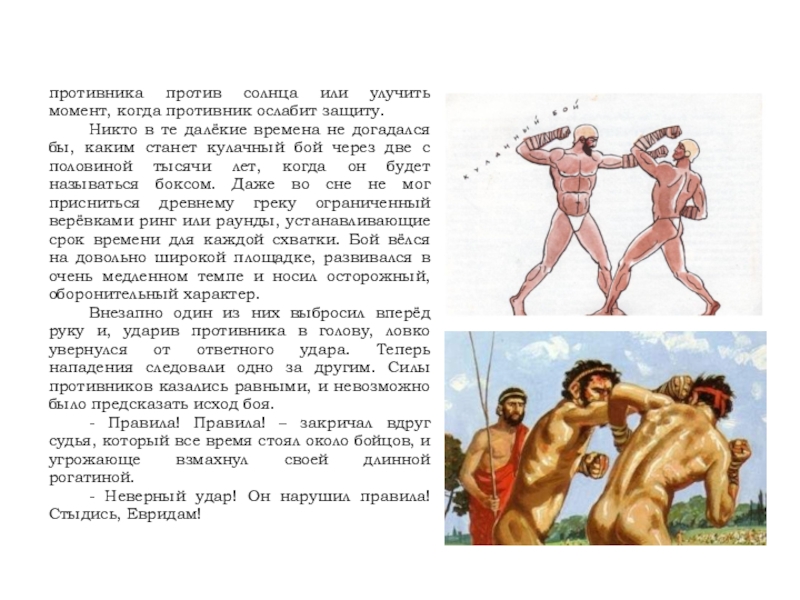в те далёкие времена не догадался бы, каким станет кулачный бой через две с половиной тысячи лет, когда он будет называться боксом. Даже во сне не мог присниться древнему греку ограниченный верёвками ринг или раунды, устанавливающие срок времени для каждой схватки. Бой вёлся на довольно широкой площадке, развивался в очень медленном темпе и носил осторожный, оборонительный характер.