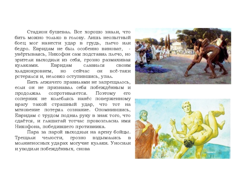 Лишь неопытный боец мог нанести удар в грудь, плечо или бедро. Евридам не был особенно виноват, - увёртываясь, Никофон сам подставил плечо, но зрители выходили из себя, грозно размахивая кулаками. Евридам славился своим хладнокровием, но сейчас он всё-таки рстерялся и, неловко оступившись, упал.