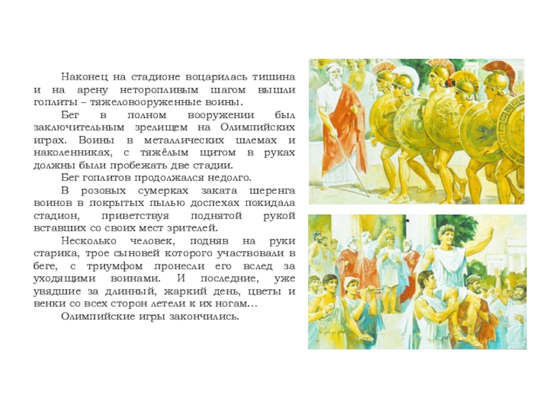 Несколько человек, подняв на руки старика, трое сыновей которого участвовали в беге, с триумфом пронесли его вслед за уходящими воинами. И последние, уже увядшие за длинный, жаркий день, цветы и венки со всех сторон летели к их ногам…