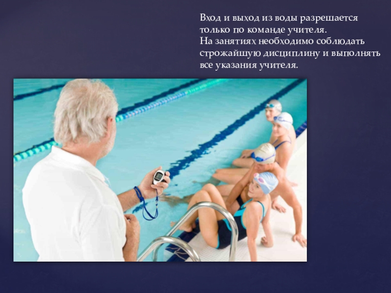 Вход и выход из воды разрешается только по команде учителя.На занятиях необходимо соблюдать строжайшую дисциплину и выполнять