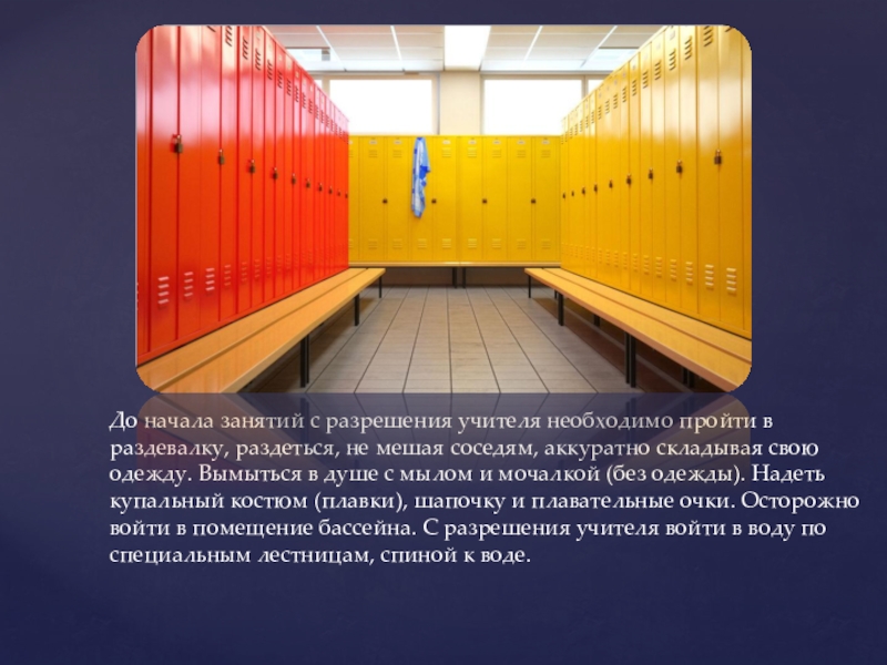 мешая соседям, аккуратно складывая свою одежду. Вымыться в душе с мылом и мочалкой (без одежды). Надеть купальный костюм (плавки), шапочку и плавательные очки. Осторожно войти в помещение бассейна. С разрешения учителя войти в воду по специальным лестницам, спиной к воде.