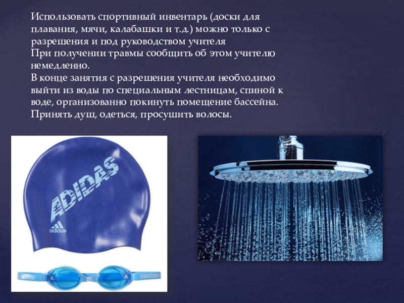 Ученик допускается к занятиям плаванием только с разрешения врача и при наличии принадлежностей для душа (мыло, мочалка,