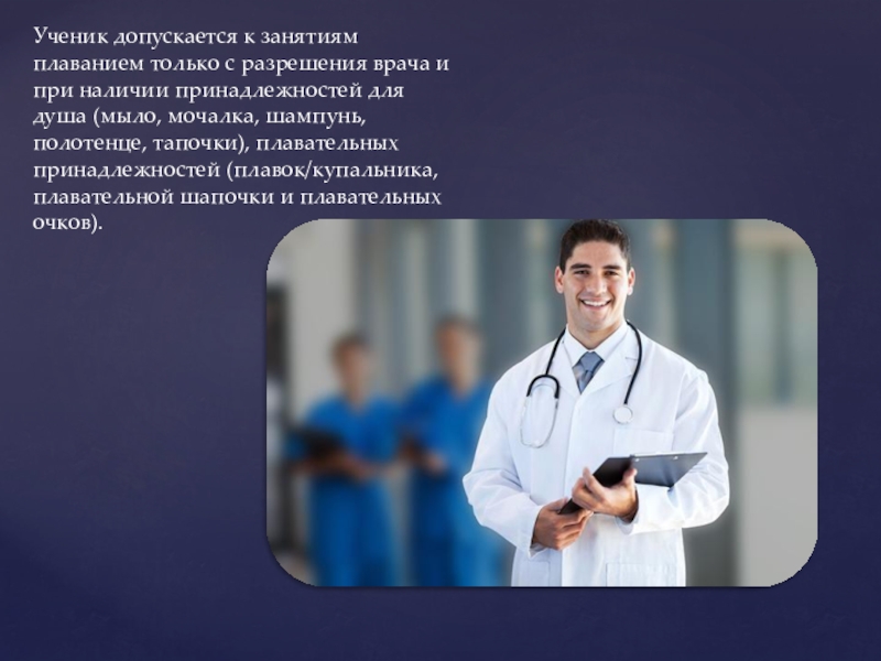Слайд 2Ученик допускается к занятиям плаванием только с разрешения врача и при