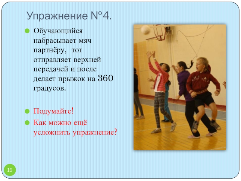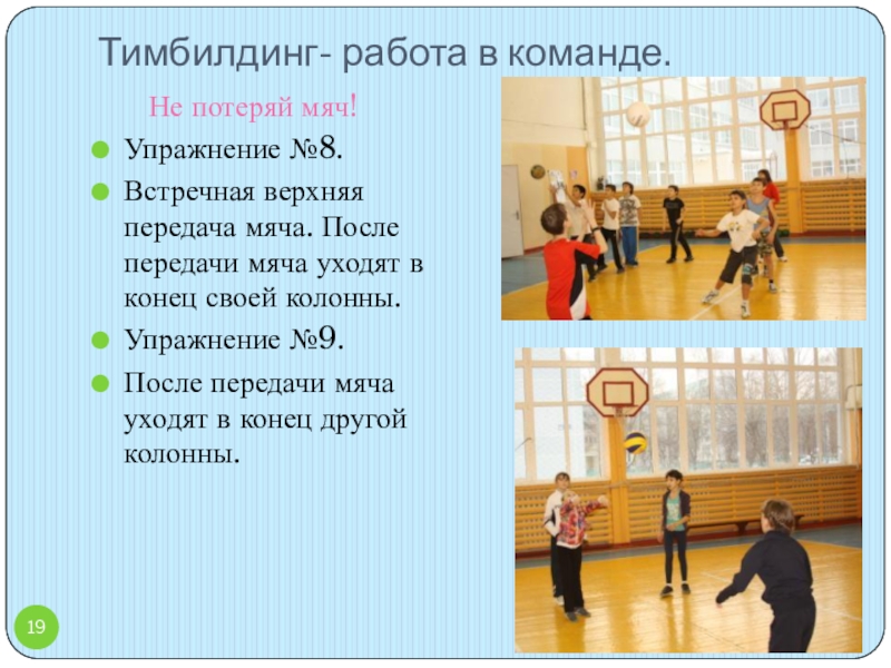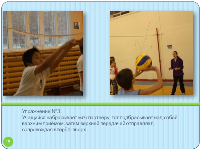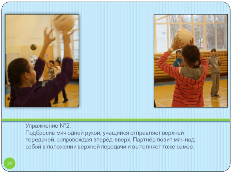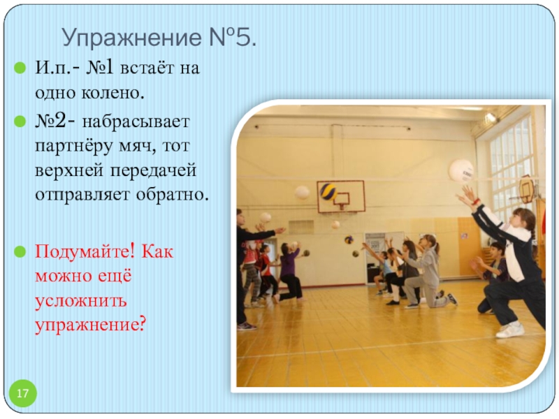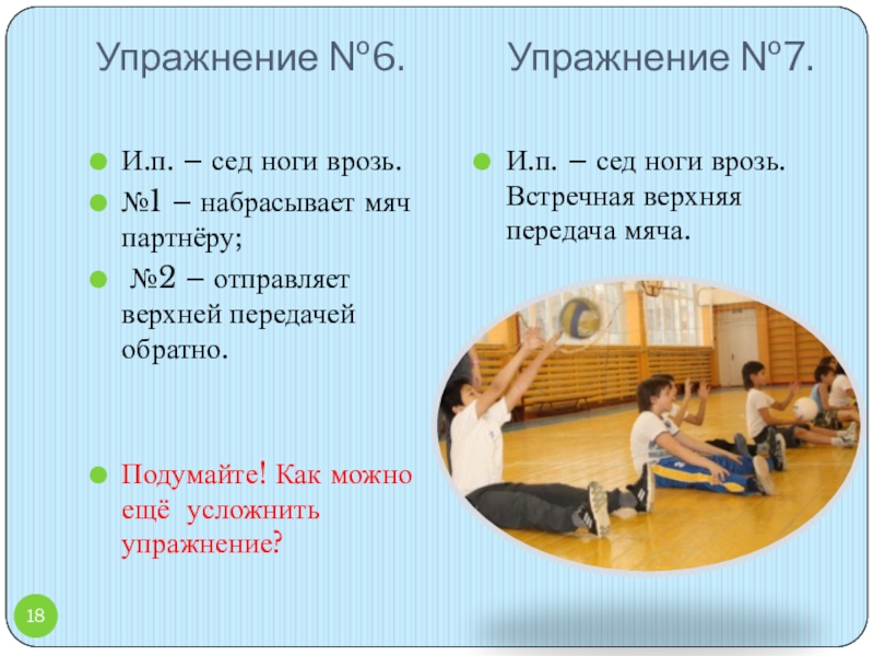 И.п. – сед ноги врозь. Встречная верхняя передача мяча.