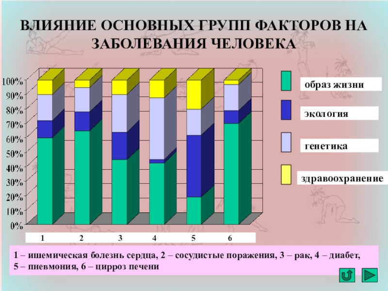 1 – ишемическая болезнь сердца, 2 – сосудистые поражения, 3 – рак, 4 – диабет,