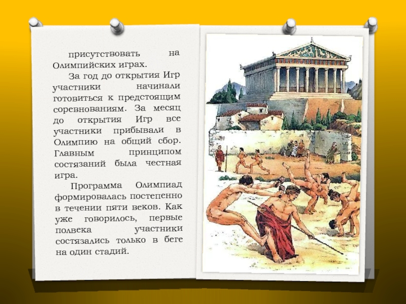 к предстоящим соревнованиям. За месяц до открытия Игр все участники прибывали в Олимпию на общий сбор. Главным принципом состязаний была честная игра.