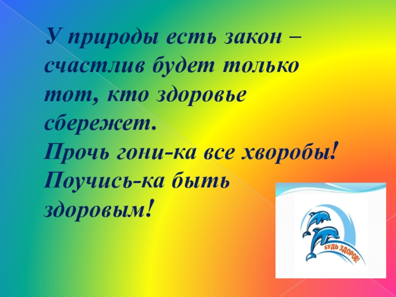 У природы есть закон – счастлив будет только тот, кто здоровье сбережет.    Прочь гони-ка