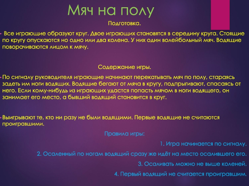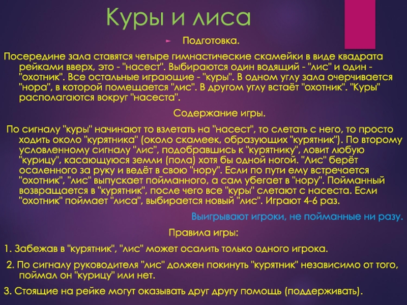 В заключительной части проводятся упражнения на гибкость, дыхательные и расслабляющие упражнения, игры малой подвижности, даются творческие задания.