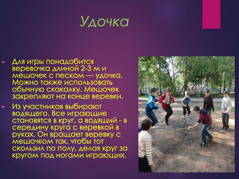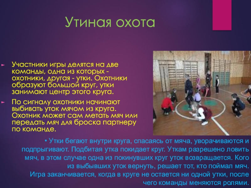 Утки бегают внутри круга, спасаясь от мяча, уворачиваются и подпрыгивают. Подбитая утка покидает круг. Уткам разрешено ловить мяч, в этом случае одна из покинувших круг уток возвращается. Кого из выбывших уток вернуть, решает тот, кто поймал мяч.