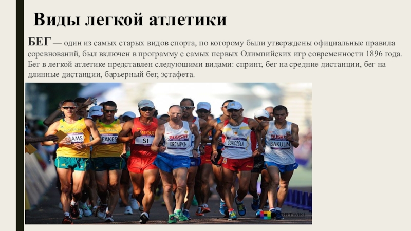 которому были утверждены официальные правила соревнований, был включен в программу с самых первых Олимпийских игр современности 1896 года. Бег в легкой атлетике представлен следующими видами: спринт, бег на средние дистанции, бег на длинные дистанции, барьерный бег, эстафета.