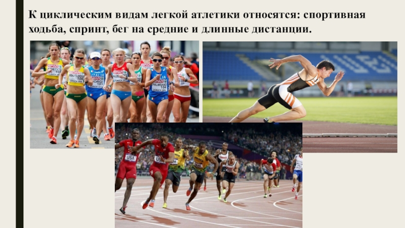 Слайд 10К циклическим видам легкой атлетики относятся: спортивная ходьба, спринт, бег на