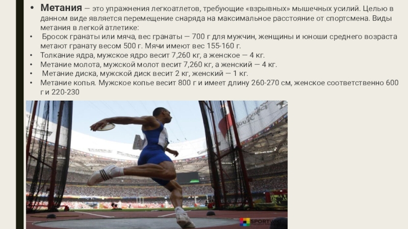 Слайд 8Метания — это упражнения легкоатлетов, требующие «взрывных» мышечных усилий. Целью в