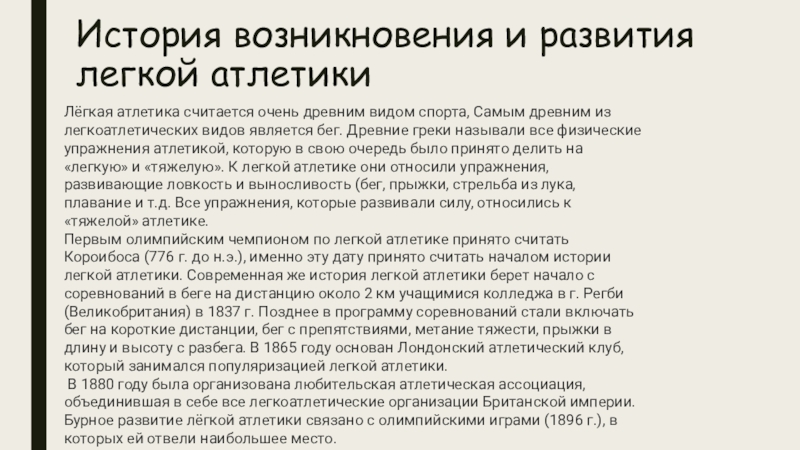 Первым олимпийским чемпионом по легкой атлетике принято считать Короибоса (776 г. до н.э.), именно эту дату принято считать началом истории легкой атлетики. Современная же история легкой атлетики берет начало с соревнований в беге на дистанцию около 2 км учащимися колледжа в г. Регби (Великобритания) в 1837 г. Позднее в программу соревнований стали включать бег на короткие дистанции, бег с препятствиями, метание тяжести, прыжки в длину и высоту с разбега. В 1865 году основан Лондонский атлетический клуб, который занимался популяризацией легкой атлетики.