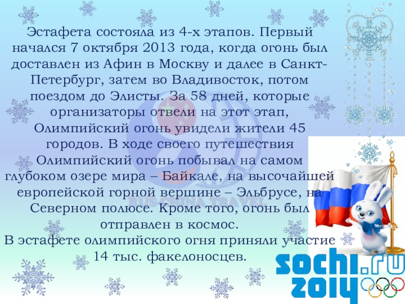 Эстафета Олимпийского огня началась в Москве 7 октября 2013 года и закончилась в Сочи 7 февраля 2014 года.