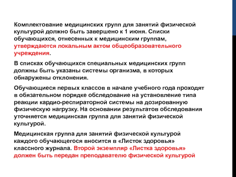 Слайд 11Комплектование медицинских групп для занятий физической культурой должно быть завершено к