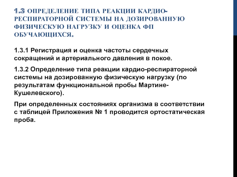 Слайд 171.3 ОПРЕДЕЛЕНИЕ ТИПА РЕАКЦИИ КАРДИО-РЕСПИРАТОРНОЙ СИСТЕМЫ НА ДОЗИРОВАННУЮ ФИЗИЧЕСКУЮ НАГРУЗКУ И ОЦЕНКА