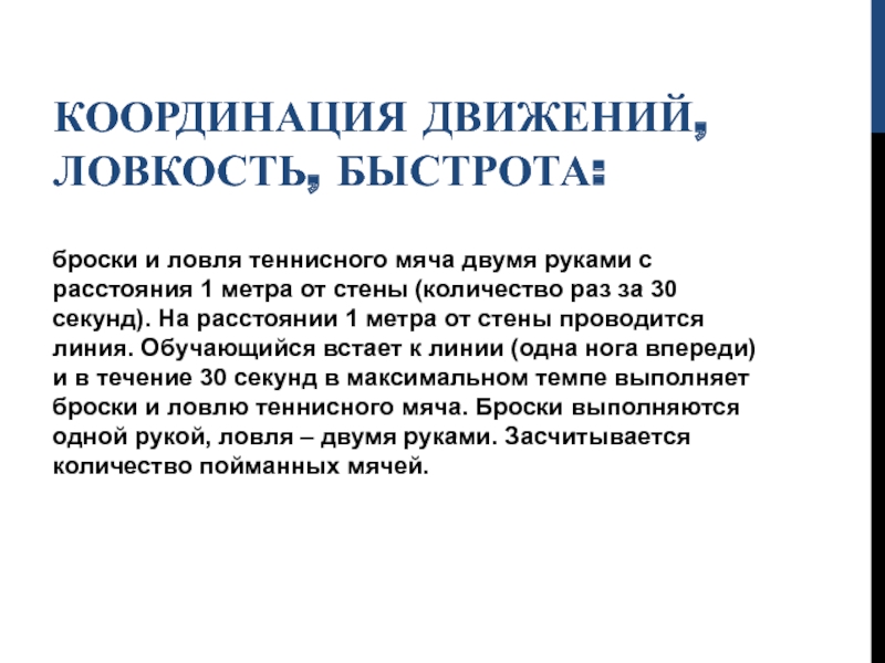 с расстояния 1 метра от стены (количество раз за 30 секунд). На расстоянии 1 метра от стены проводится линия. Обучающийся встает к линии (одна нога впереди) и в течение 30 секунд в максимальном темпе выполняет броски и ловлю теннисного мяча. Броски выполняются одной рукой, ловля – двумя руками. Засчитывается количество пойманных мячей.